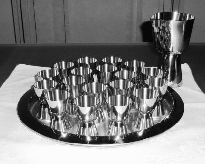 Neben dem Gemeinschaftskelch werden auch Einzelkelche benutzt. "Aus einem Kelch trinken" nimmt hier den Umweg über den Gießkelch: Erst wenn bei der Austeilung die Spendeworte "Christi Blut für dich vergossen" oder "der Kelch des Heils für dich" gesprochen sind, wird der Traubensaft in den Einzelkelch eingegossen und auch gleich ausgetrunken.